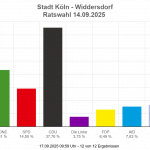 - Ergebnisse der Kommunalwahl am 14.9.2025 in WiddersdorfDie Ergebnisse der Wahl in unserem Ortsteil Widdersdorf für den Rat der Stadt Köln und der Bezirksvertretung Lindenthal können Sie den Graphiken entnehmen. Weitere Details zu den Wahlergebnissen 2025 finden …