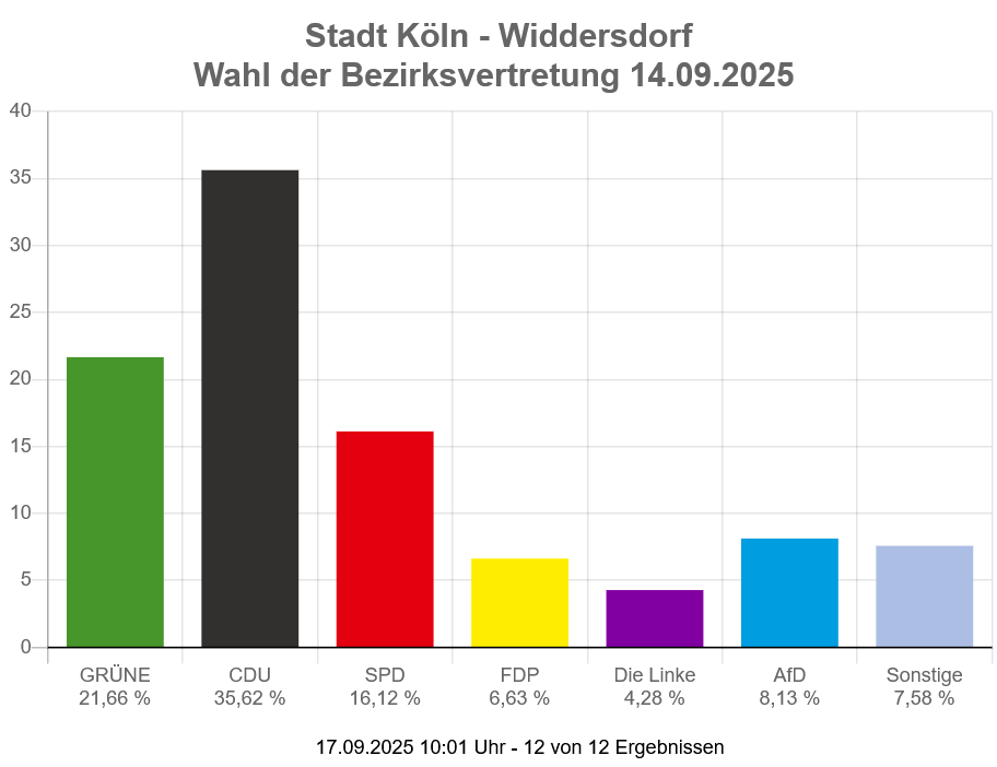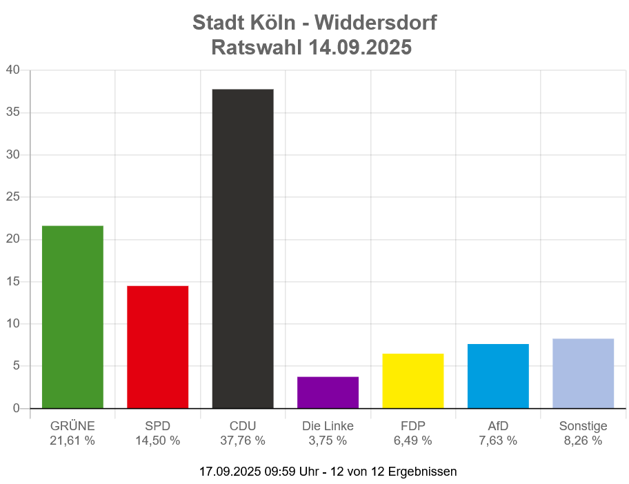 Die Ergebnisse der Wahl in unserem Ortsteil Widdersdorf für den Rat der Stadt Köln und der Bezirksvertretung Lindenthal können Sie den Graphiken entnehmen.