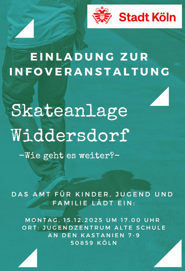 Informationsveranstaltung am 15.12.2025 zur geplanten Skateanlage Die Stadt Köln lädt interessierte Bürgerinnen und Bürger um 17 Uhr in das Jugendzentrum „Alte Schule“, An den Kastanien 7 in Widdersdorf zu dieser Informationsveranstaltung ein. Einladung Anwohner für 15-12-2025 Infoveranstaltung WiddersdorfHerunterladen